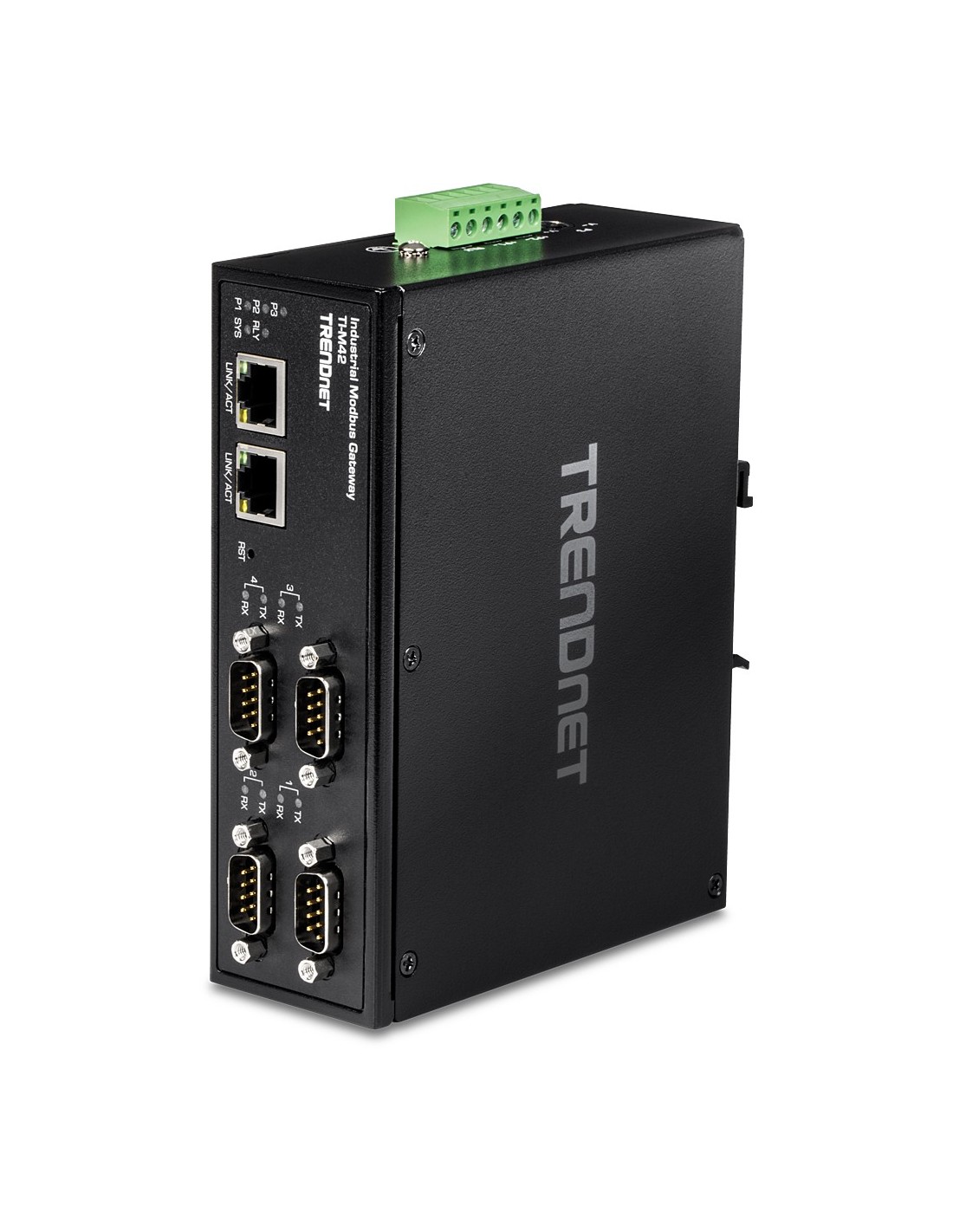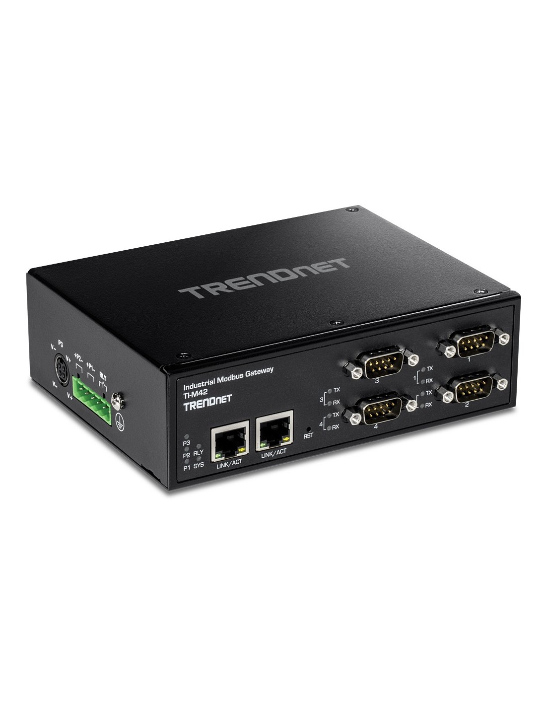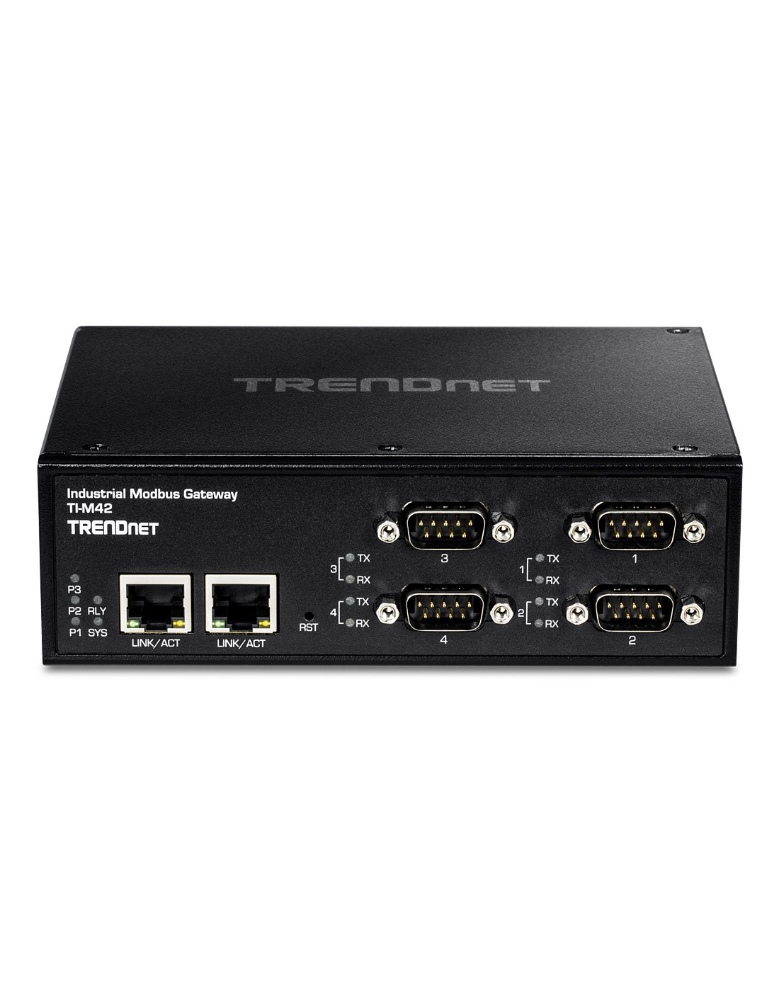 La gateway modbus industrial de TRENDnet, modelo TI-M42, ofrece cuatro conexiones serie y dos puertos Fast Ethernet a distancias de 100 m (328 pies) utilizando cableado Cat5e . Esta pasarela industrial permite a los usuarios conectar cuatro dispositivos serie modbus a una red.