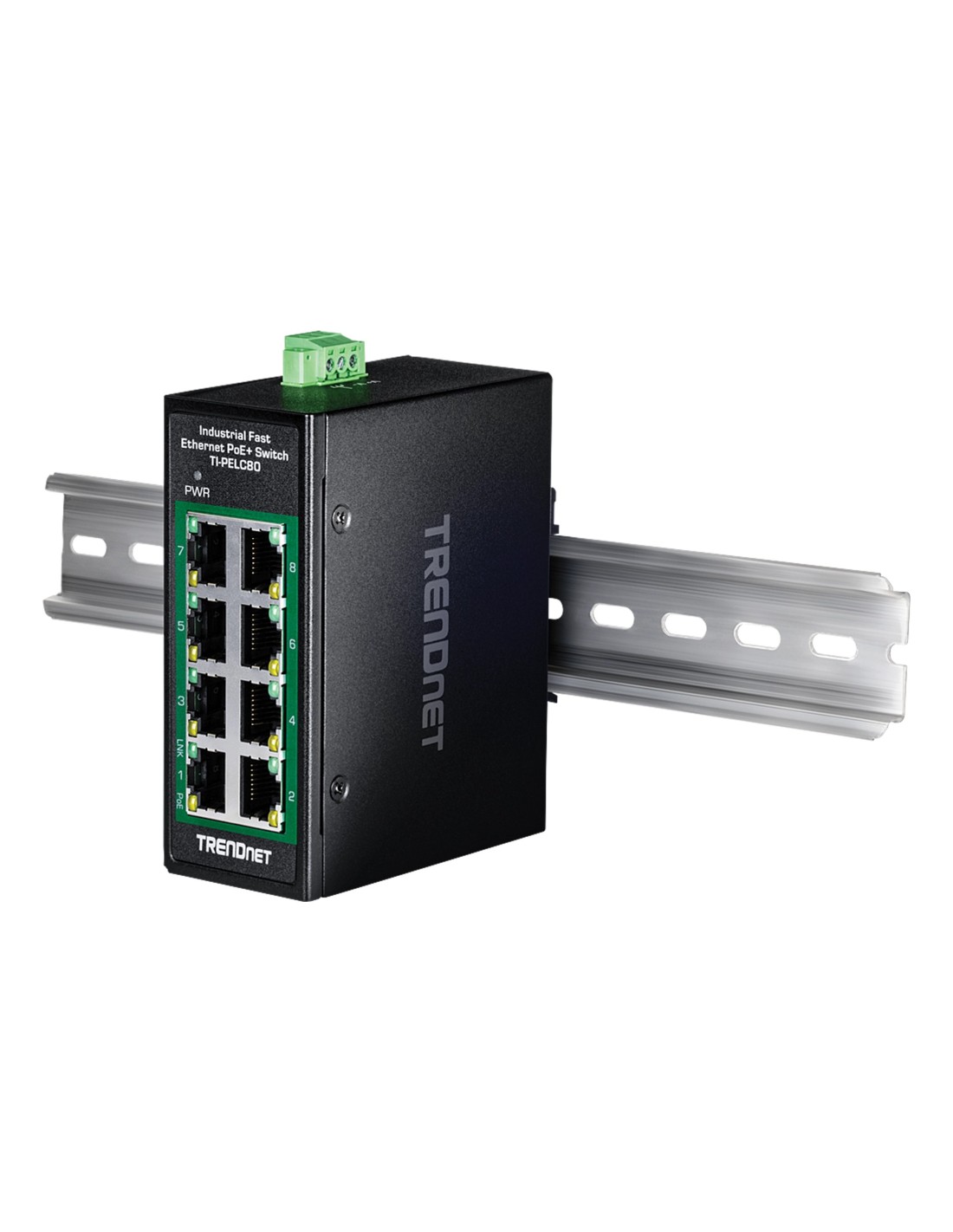 Trendnet TI-PELC80. Tipo de interruptor: No administrado. Puertos tipo básico de conmutación RJ-45 Ethernet: Fast Ethernet (10/100), Cantidad de puertos básicos de conmutación RJ-45 Ethernet: 8. Bidireccional completo (Full duplex). Tabla de direcciones MAC: 1000 entradas, Capacidad de conmutación: 1,6 Gbit/s. Estándares de red: IEEE 802.3, IEEE 802.3af, IEEE 802.3at, IEEE 802.3u, IEEE 802.3x. Voltaje de entrada DC: 48 - 56 V. Energía sobre Ethernet (PoE). Montaje de pared