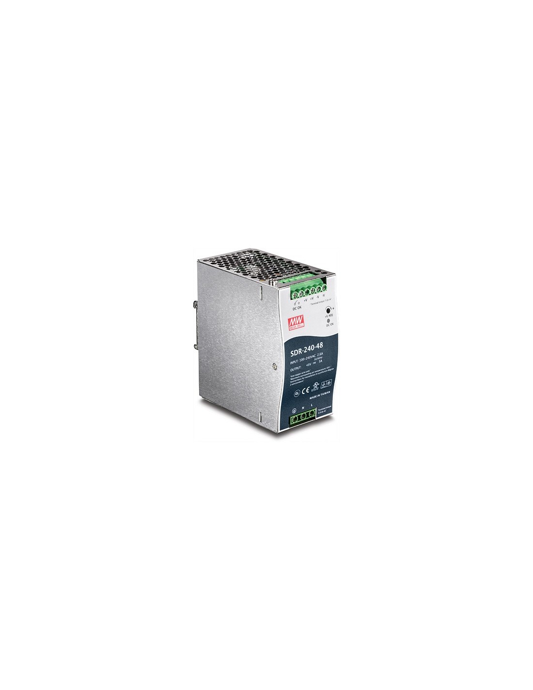 La Fuente de alimentación DIN-rail industrial de salida única de 240 W de alto rendimiento de TRENDnet, modelo TI-S24048 (Mean Well SDR-240-48), suministra hasta 240 vatios de potencia (48 V, 5 A) a equipos PoE industriales como switchs, cámaras de red y puntos de acceso WiFi. Esta fuente de alimentación cuenta con corrección activa de factor de potencia o PFC, material de montaje DIN-rail y protección contra sobrecarga de corriente.