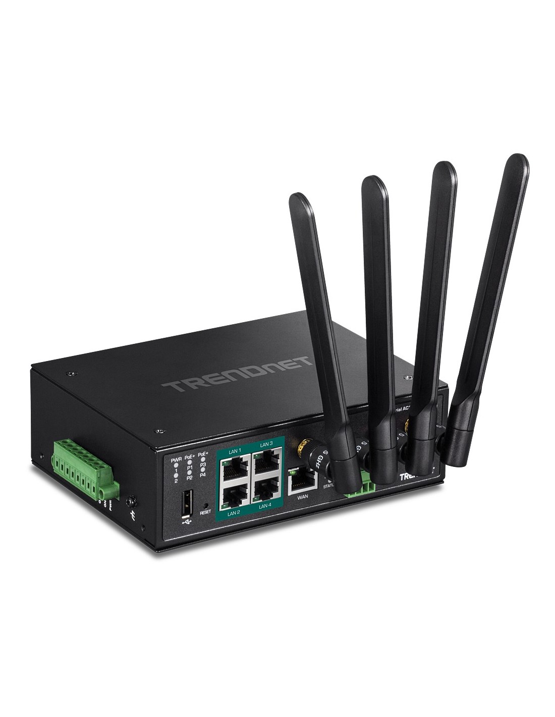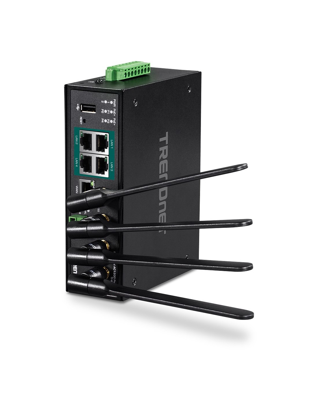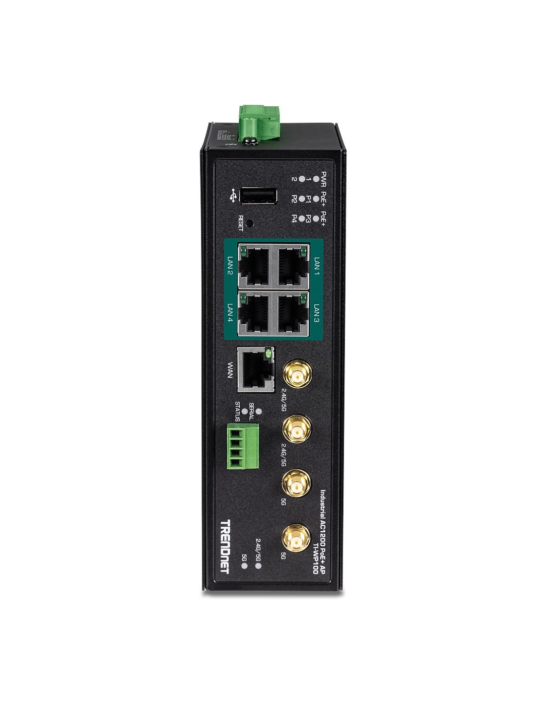 El router Gigabit PoE+ de banda dual wireless AC1200 Industrial de TRENDnet, modelo TI-WP100, dispone de WiFi AC1200 de banda dual para maximizar las velocidades de red del dispositivo; está equipado con una red AC inalámbrica a 867 Mbps y una red N inalámbrica a 300 Mbps. Admite conexiones híbridas doble WAN (Ethernet para modos de balance de cargas o tolerancia a fallos (failover)) y acceso encriptado a red privada virtual (VPN) para usuarios remotos. Cuatro puertos Gigabit PoE+ permiten a los usuarios alimentar puntos de acceso, cámaras IP y otros dispositivos PoE+ directamente desde el router. Admite dispositivos tanto PoE (802.3af) como PoE+ (802.3at), con una potencia PoE disponible de 120W. El router gigabit AC1200 industrial está equipado con una carcasa de metal con clasificación IP30 y está diseñado para funcionar dentro de un amplio intervalo de temperaturas (de -30° a 70° C (-22° a 158° F) en entornos industriales.