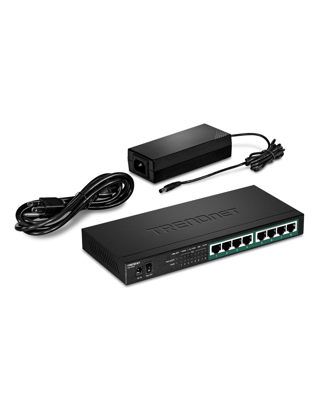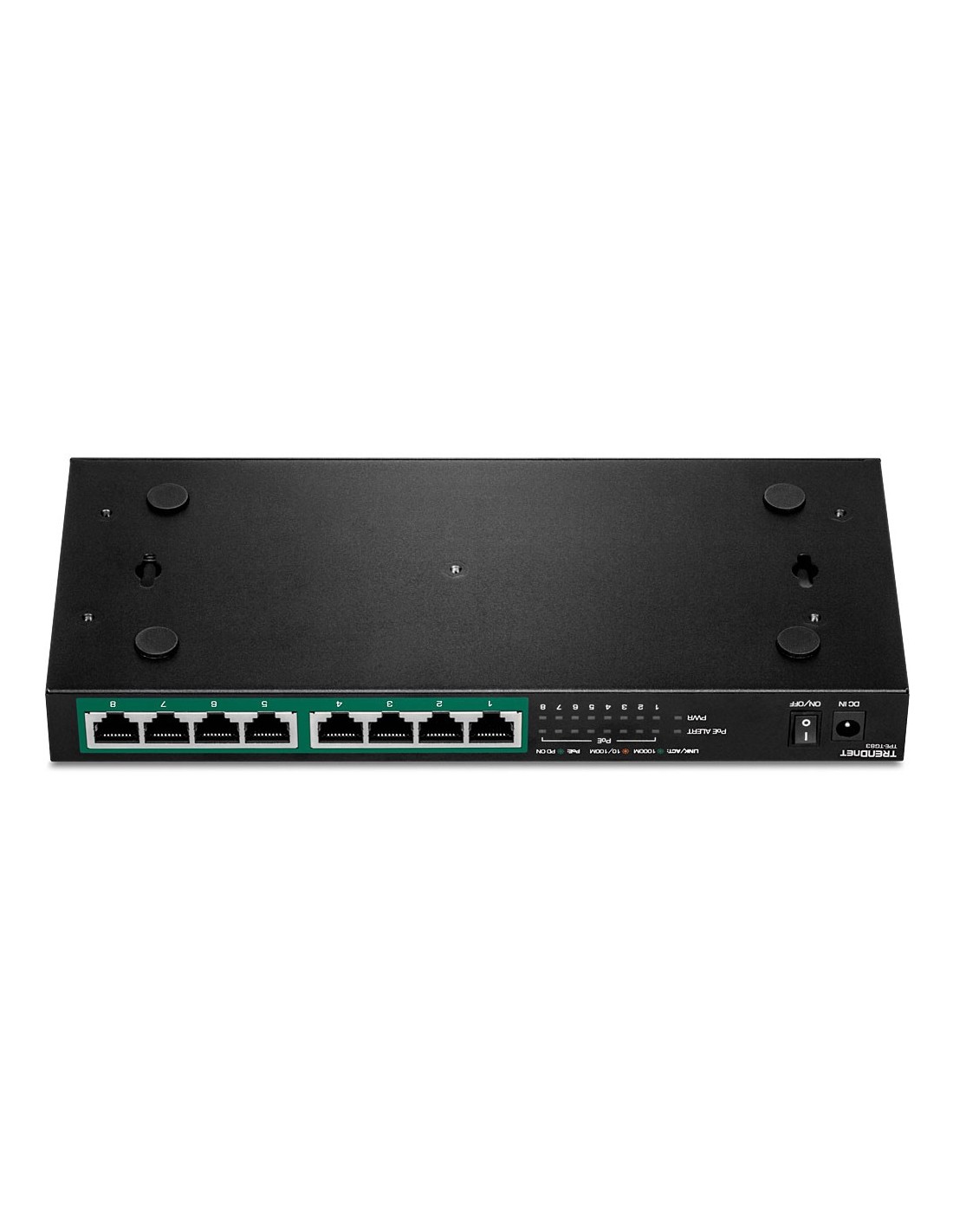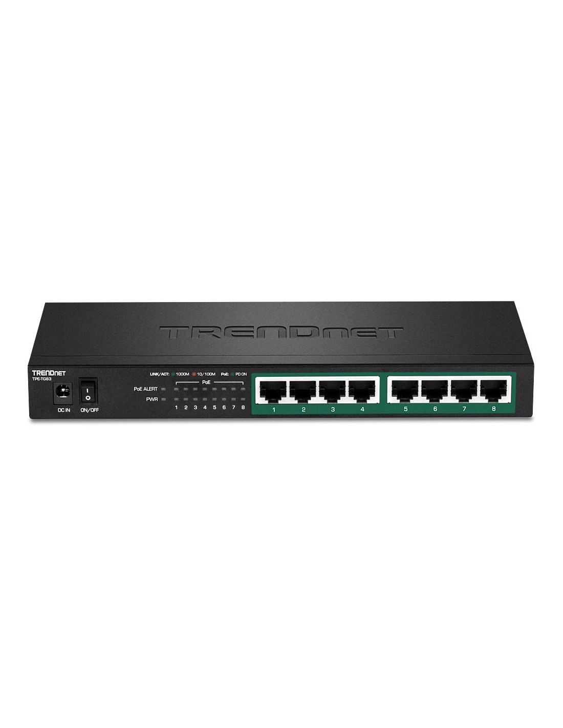 Trendnet TPE-TG83. Tipo de interruptor: No administrado. Puertos tipo básico de conmutación RJ-45 Ethernet: Gigabit Ethernet (10/100/1000), Cantidad de puertos básicos de conmutación RJ-45 Ethernet: 8. Bidireccional completo (Full duplex). Tabla de direcciones MAC: 4000 entradas, Capacidad de conmutación: 16 Gbit/s. Estándares de red: IEEE 802.3, IEEE 802.3ab, IEEE 802.3af, IEEE 802.3at, IEEE 802.3p, IEEE 802.3u, IEEE 802.3x. Energía sobre Ethernet (PoE). Montaje de pared