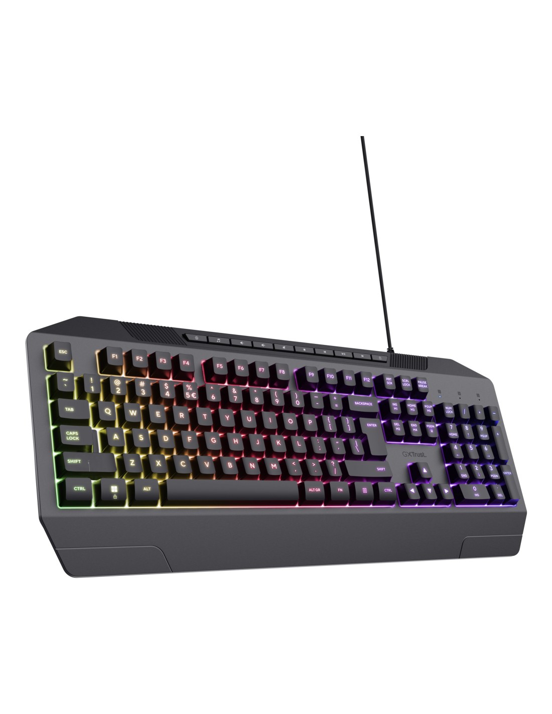Trust GXT 836 Evocx Teclado gaming iluminado. Formato del teclado: Completo (100%). Estilo de teclado: Derecho. Tecnología de conectividad: Alámbrico, Interfaz del dispositivo: USB, Interruptor del teclado: Interruptor de membrana, Diseño de teclado: QWERTY, Teclado, cantidad de teclas: 114. Tipo de retroiluminación: LED RGB, Descansa muñecas. Uso recomendado: Juego. Color del producto: Negro