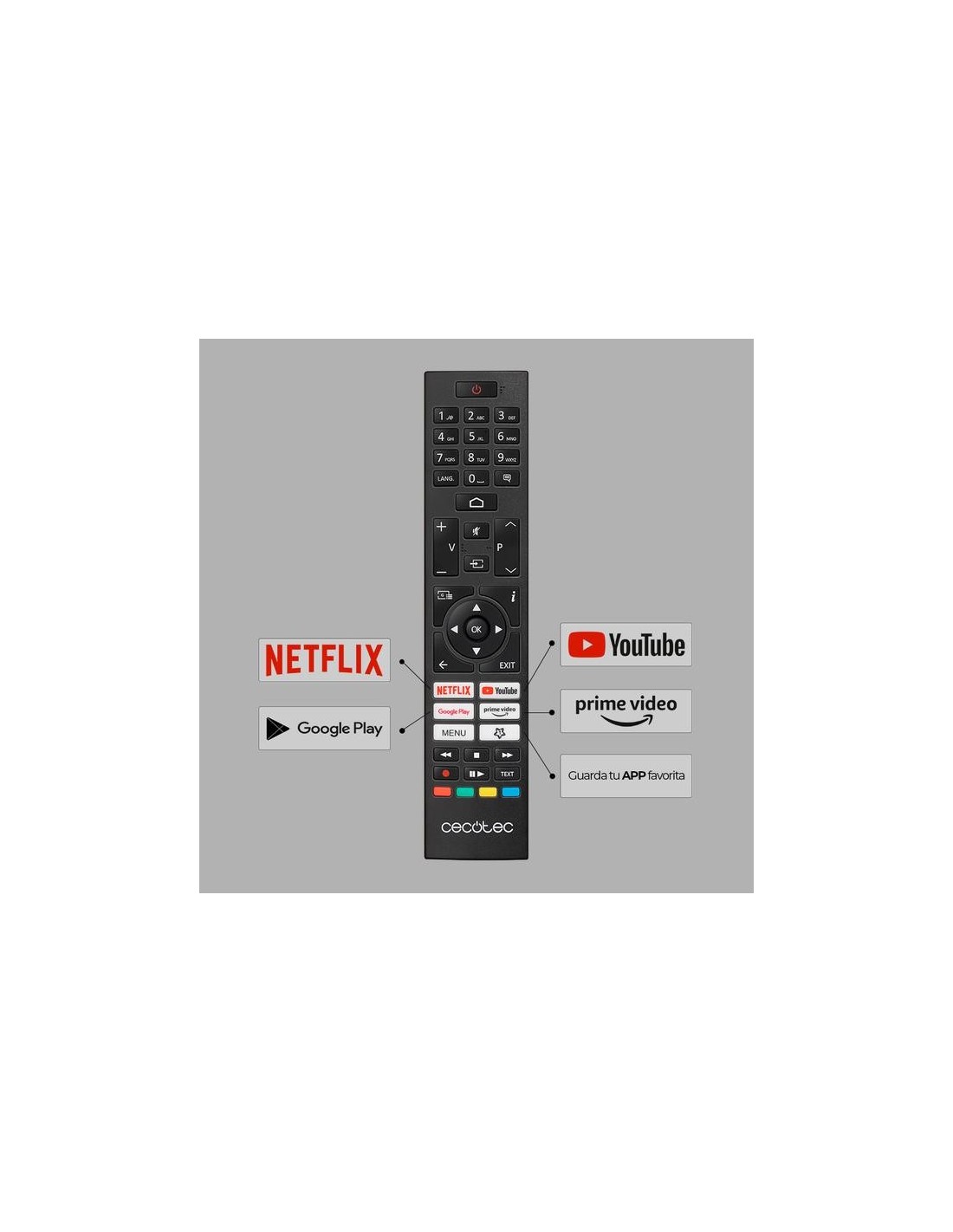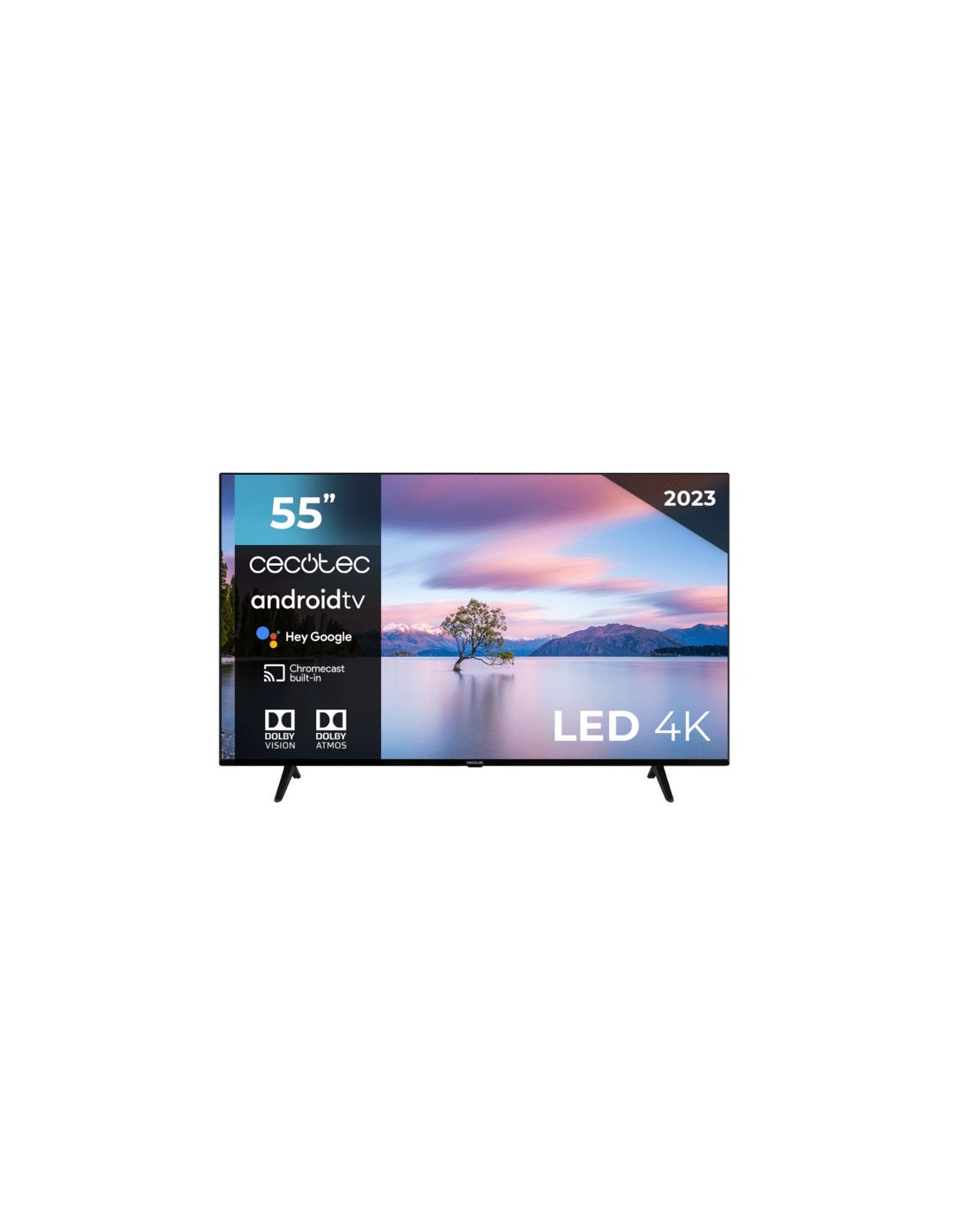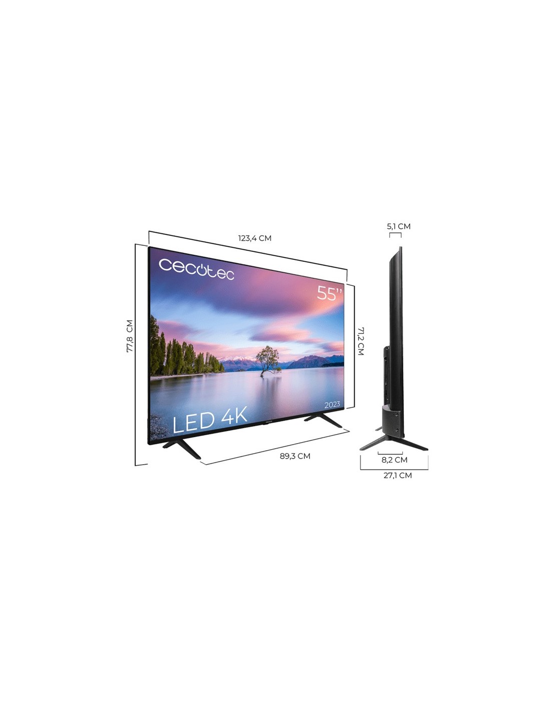 Cecotec 02562. Diagonal de la pantalla: 139,7 cm (55"), Resolución de la pantalla: 3840 x 2160 Pixeles, Tipo HD: 4K Ultra HD, Tecnología de visualización: LED, Forma de la pantalla: Plana. Smart TV. Relación de aspecto nativa: 16:9. Formato de señal digital: DVB-C, DVB-S, DVB-S2, DVB-T, DVB-T2. Ethernet. Color del producto: Negro