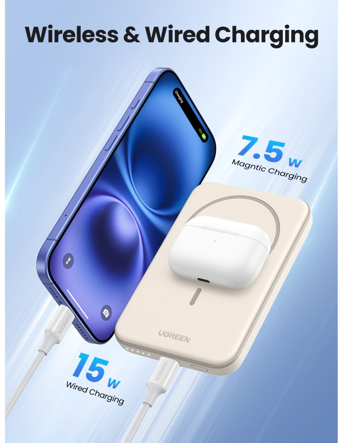[Carregamento magnético] UGREEN banco de energia magnético 5000 mAh suporta carregamento magnético Qi 15 W e é perfeitamente compatível com os modelos da série iPhone 16/15/14/13/12 de 7,5 W. Recomendamos usar um carregador USB C com PD15 W ou superior para carregar este banco de energia. [PD15W USB C] Além do carregamento sem fio, o banco de energia também suporta carregamento por cabo USB C de 15 W no máximo. Um cabo USB C para USB C está incluído e, portanto, também é compatível com Galaxy S24, S23, iPhone 16/16 Plus/16 Pro/16 Pro Max etc. [Magnetismo poderoso] A poderosa força magnética de 10N pode conectar firmemente o banco de energia e o seu iPhone, para que não precise de se preocupar com a desconexão durante o carregamento. Os ímanes integrados mantêm o powerbank firmemente no lugar. [Excelente segurança] o UGREEN power bank possui um sistema de proteção de segurança inteligente incorporado. Pode proteger o seu dispositivo contra sobrecorrente, sobretensão, curto-circuito e alta temperatura, proporcionando uma experiência de carregamento segura. A superfície de silicone macio protege o seu telefone contra arranhões. [Compacto e portátil] tamanho: 10,6 x 6,9 x 1,3 cm. A bateria externa magnética UGREEN tem o tamanho de um cartão de crédito e cabe facilmente no bolso do casaco. Ótimo para carregar enquanto viaja.
