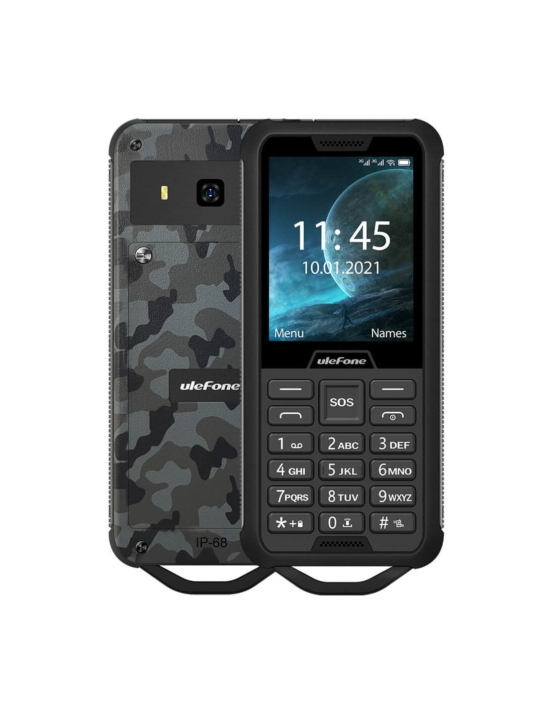Ulefone Armor Mini 2. Factor de forma: Barra. Capacidad de la tarjeta SIM: SIM doble. Diagonal de la pantalla: 6,1 cm (2.4"), Resolución de la pantalla: 240 x 320 Pixeles. Resolución de la cámara trasera (numérica): 0,3 MP. Bluetooth. Capacidad de batería: 2100 mAh. Peso: 158 g. Color del producto: Camuflaje