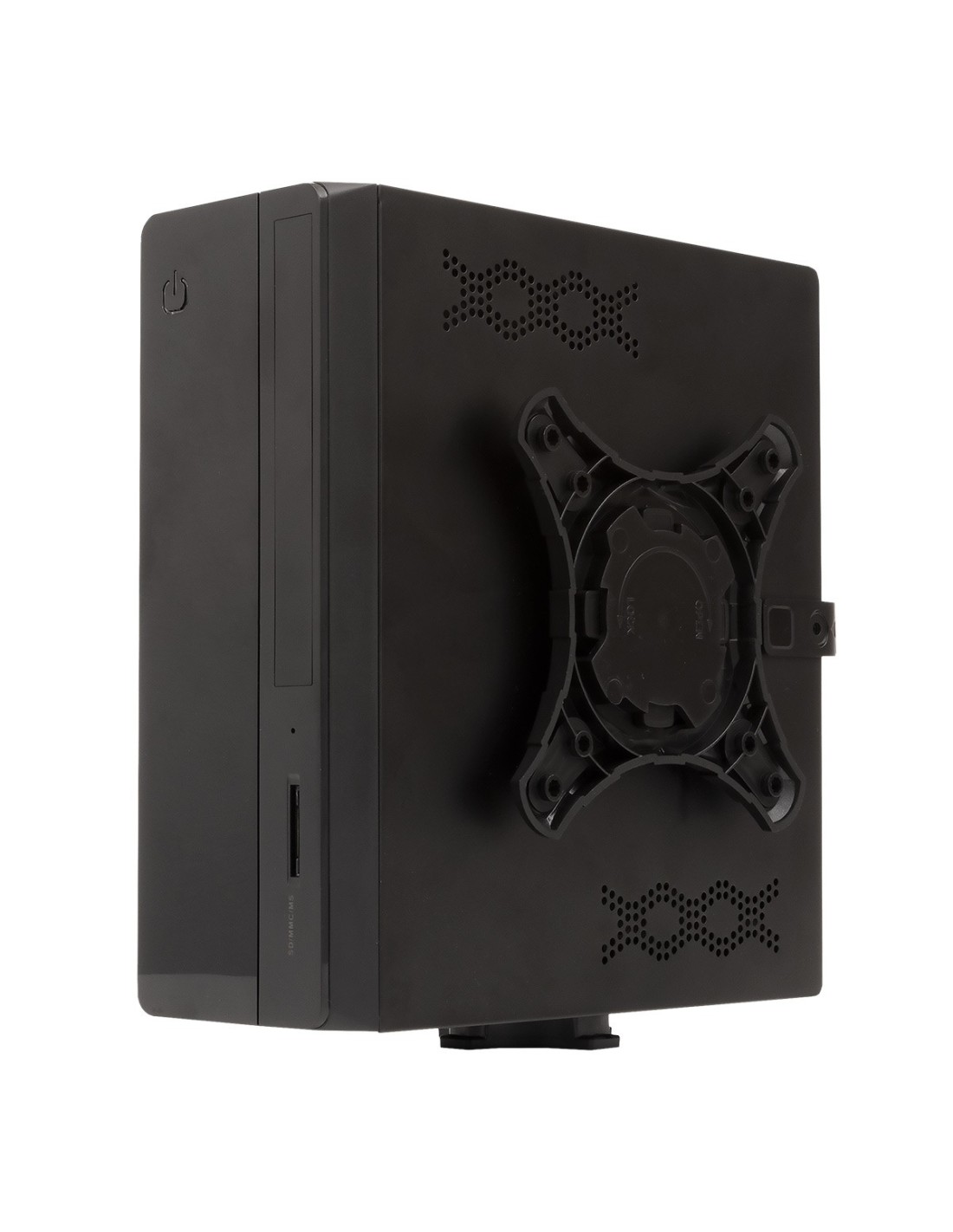 El modelo 1007 es una caja con formato sobremesa, que destaca por su diseño moderno, con un frontal negro brillante y una luz azul intenso, que informa sobre su actividad. Su estructura y dimensiones la hacen muy versátil, ya que se puede colocar en posición horizontal o vertical, manteniendo su estabilidad mediante el soporte VESA que incluye.