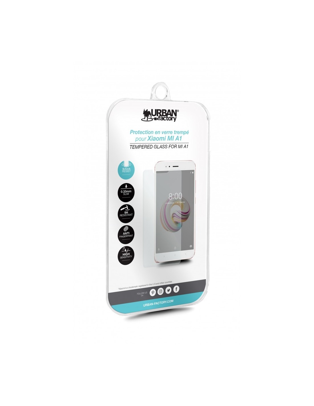 Urban Factory TGP72UF. Marca compatible: Xiaomi, Compatibilidad: Xiaomi Mi A1, Funciones de protección: Resistente a golpes. Material: Vidrio templado, Color del producto: Transparente. Cantidad por paquete: 1 pieza(s)