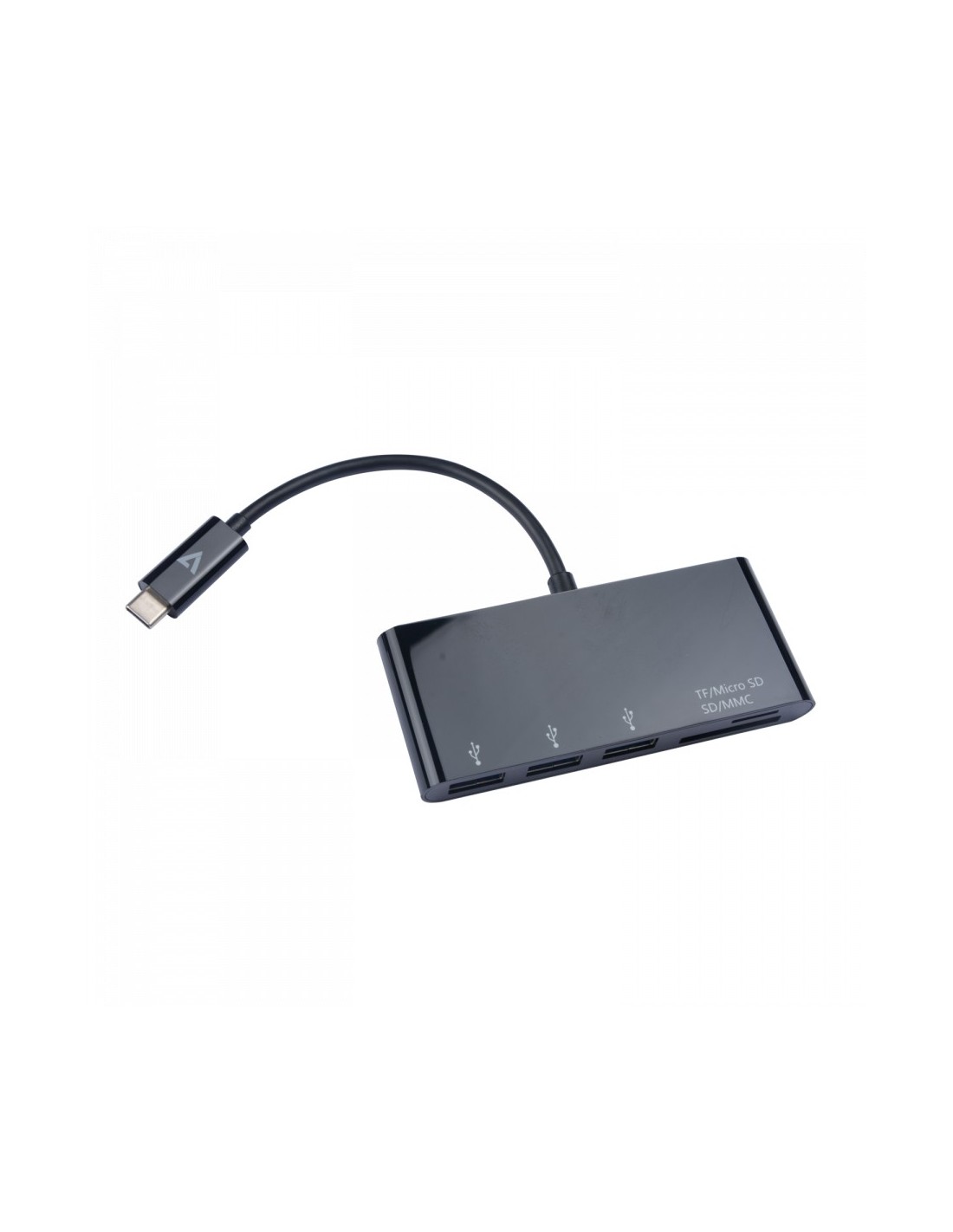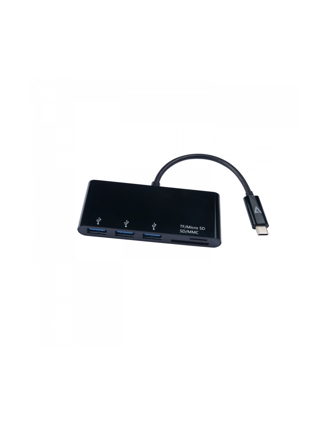 V7 Adattatore USB nero da USB-C maschio a 3 x USB 3.0 A femmina, Micro SD, SD/MMC, USB 3.2 Gen 1 (3.1 Gen 1) Type-C, Negro, MMC, MicroSD (TransFlash), SD, USB 3.2 Gen 1 (3.1 Gen 1) Type-A, Vietnam, CE, FCC, RoHS, WEEE