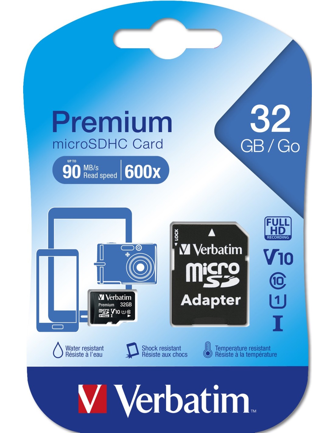 Verbatim Premium. Capacidad: 32 GB, Tipo de tarjeta flash: MicroSDHC, Clase de memoria flash: Clase 10, Velocidad de lectura: 10 MB/s, Velocidad de escritura: 10 MB/s. Color del producto: Negro