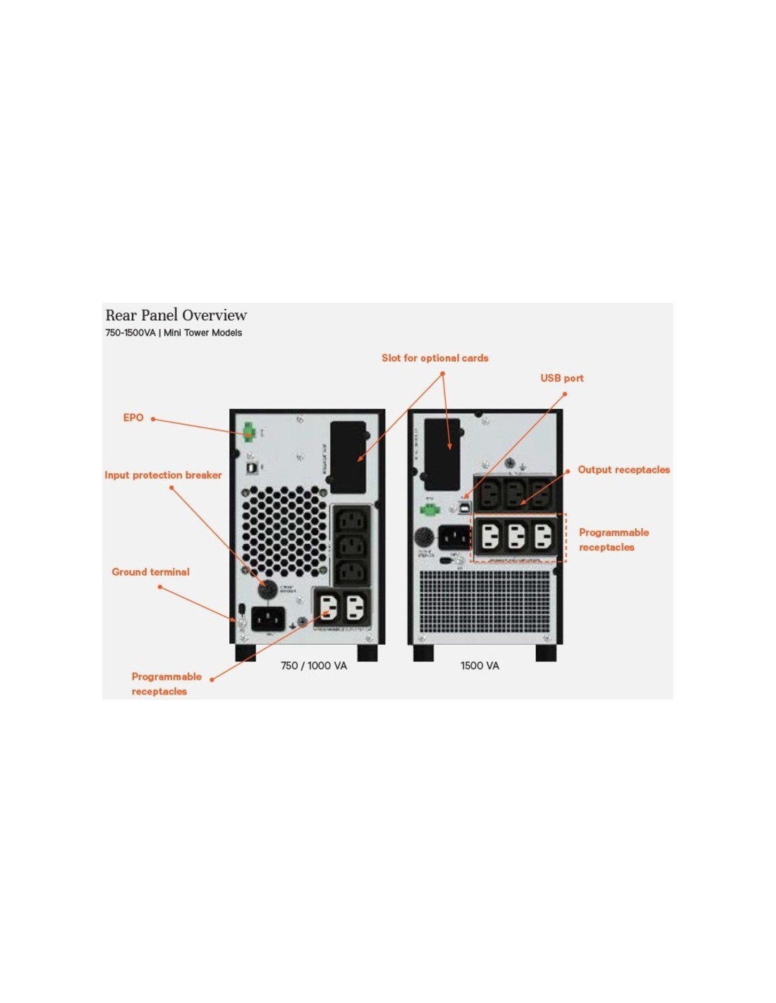 Vertiv Liebert EDGE-1500IMT. Topología UPS: Línea interactiva, Capacidad de potencia de salida (VA): 1,5 kVA, Potencia de salida: 1350 W. Tipo de salida AC: C13 acoplador, Conector: C14 acoplador, Cantidad de salidas AC: 5 salidas AC. Tiempo de recarga de la batería: 3 h. Factor de forma: Torre, Color del producto: Negro, Tipo de visualizador: LCD. Certificados de conformidad: CE, RoHS, Certificación: CE, CB Report, EAC, RCM, UKCA
