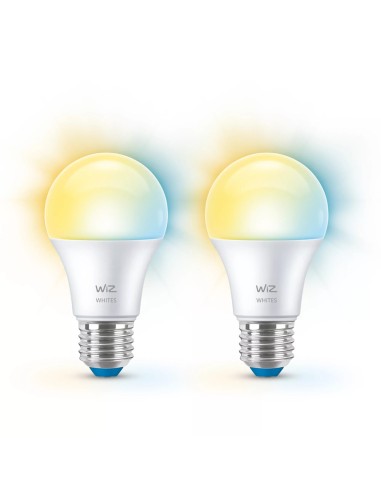 WiZ Bombilla 60 W A60 E27 x2. Tipo: Bombilla inteligente, Interfaz: Wi-Fi/Bluetooth, Color del producto: Blanco. Clase de eficiencia de energía: F, Voltaje de entrada: 220-240 V, Frecuencia de entrada AC: 50-60 Hz. Ancho: 60 mm, Profundidad: 111 mm, Altura: 111 mm. Ancho del paquete: 140 mm, Profundidad del paquete: 70 mm, Altura del paquete: 160 mm. Cantidad por paquete: 2 pieza(s)