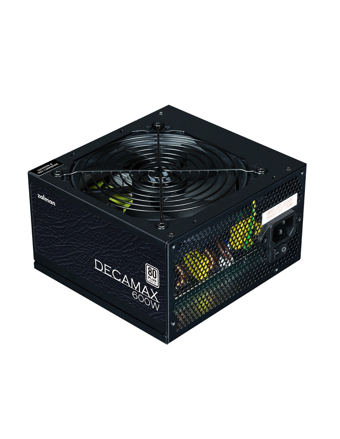 Zalman Decamax. Potencia total: 600 W, Voltaje de entrada AC: 200 - 240 V, Frecuencia de entrada AC: 50/60 Hz. Utilizar con: PC, Factor de forma de fuente de alimentación (PSU): ATX, Certificación 80 PLUS: 80 PLUS. Color del producto: Negro, Diámetro de ventilador: 12 cm. Certificados de conformidad: CB, CE, EAC, KC, RoHS. Ancho: 140 mm, Profundidad: 150 mm, Altura: 86 mm