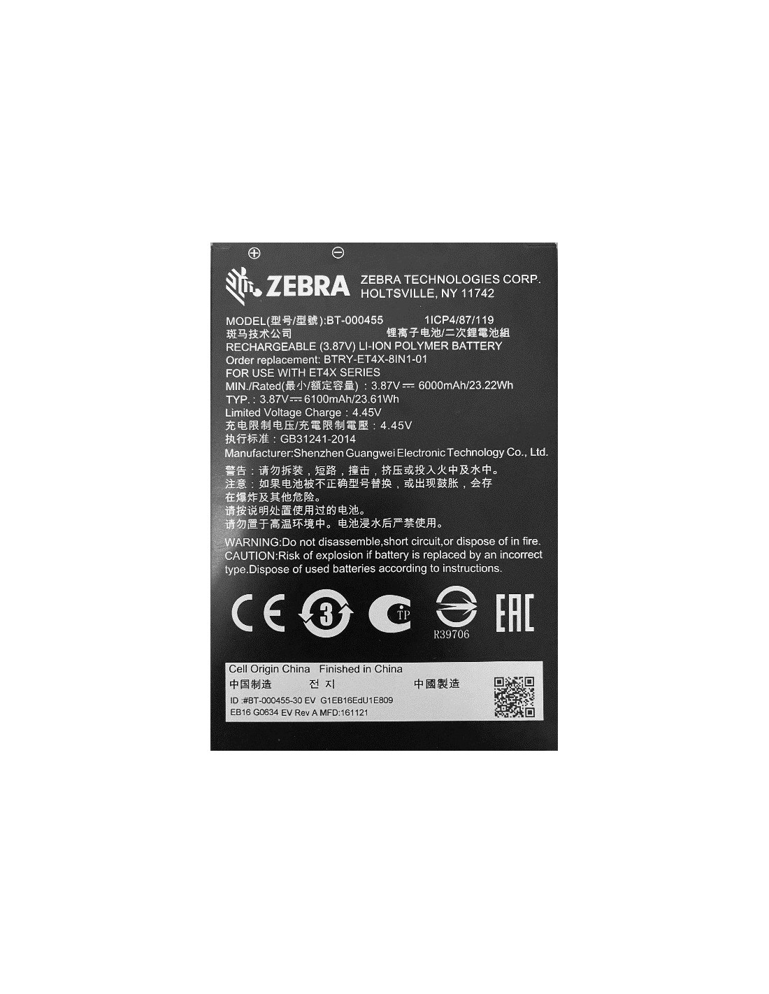 Zebra BTRY-ET4X-8IN1-01. Tipo: Batería, Marca compatible: Zebra, Compatibilidad: ET45 - 8"