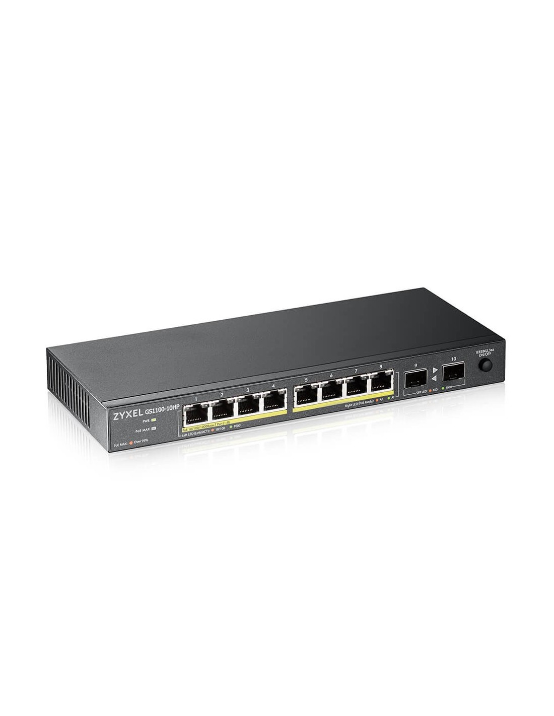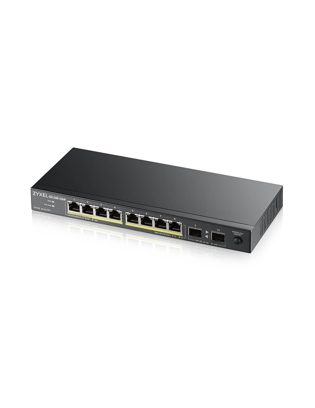 Zyxel GS1100-10HP v2. Tipo de interruptor: No administrado. Puertos tipo básico de conmutación RJ-45 Ethernet: Gigabit Ethernet (10/100/1000), Cantidad de puertos básicos de conmutación RJ-45 Ethernet: 8. Tabla de direcciones MAC: 8000 entradas, Capacidad de conmutación: 20 Gbit/s. Estándares de red: IEEE 802.1p, IEEE 802.3, IEEE 802.3ab, IEEE 802.3af, IEEE 802.3at, IEEE 802.3az, IEEE 802.3u, IEEE.... Voltaje de entrada DC: 54 V. Conector eléctrico: Toma de entrada de CC. Energía sobre Ethernet (PoE). Montaje de pared