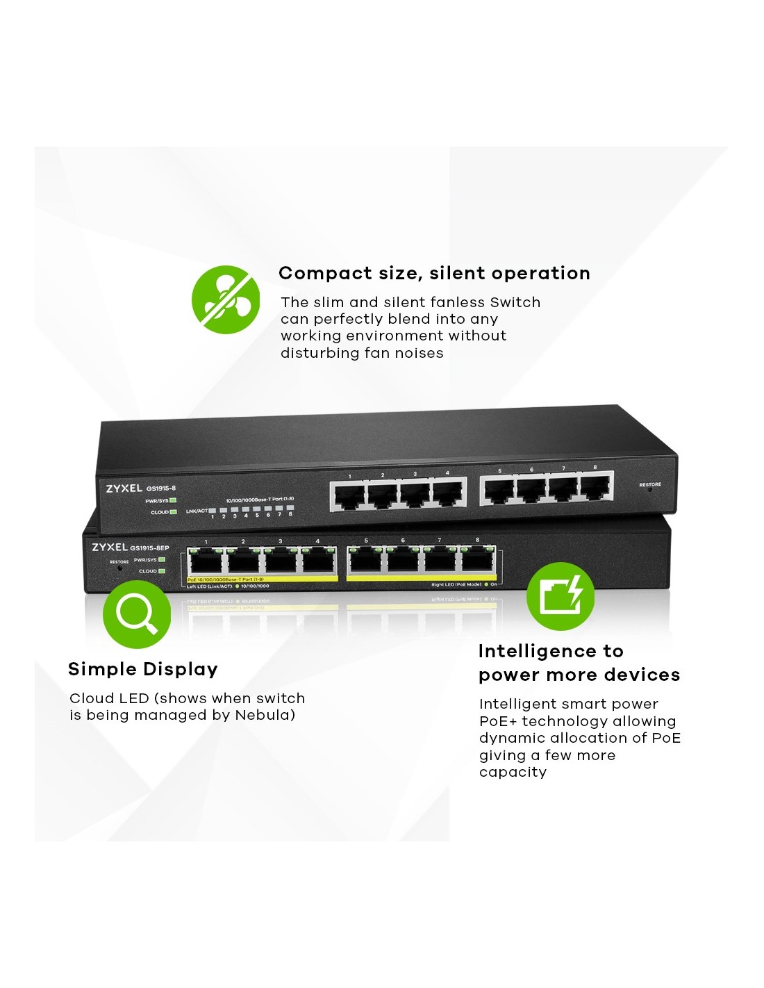 ZYXEL GS1915-8, 8-PORT GBE SMART HYBRID MODE SWITCH, STANDALONE OR NEBULAFLEX CLOUD, DESKTOP, FANLESS