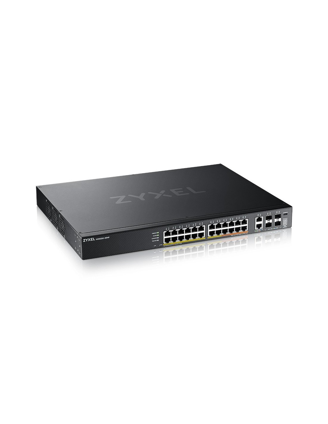 Zyxel XGS2220-30HP. Tipo de interruptor: Gestionado, Capa del interruptor: L3. Puertos tipo básico de conmutación RJ-45 Ethernet: Gigabit Ethernet (10/100/1000), Cantidad de puertos básicos de conmutación RJ-45 Ethernet: 24, Número de módulos SFP+ instalados: 4. Tabla de direcciones MAC: 32000 entradas, Capacidad de conmutación: 168 Gbit/s. Estándares de red: IEEE 802.1Q, IEEE 802.1ab, IEEE 802.1p, IEEE 802.1x, IEEE 802.3ab, IEEE 802.3ae, IEEE 802.3af,.... Energía sobre Ethernet (PoE). Montaje en rack