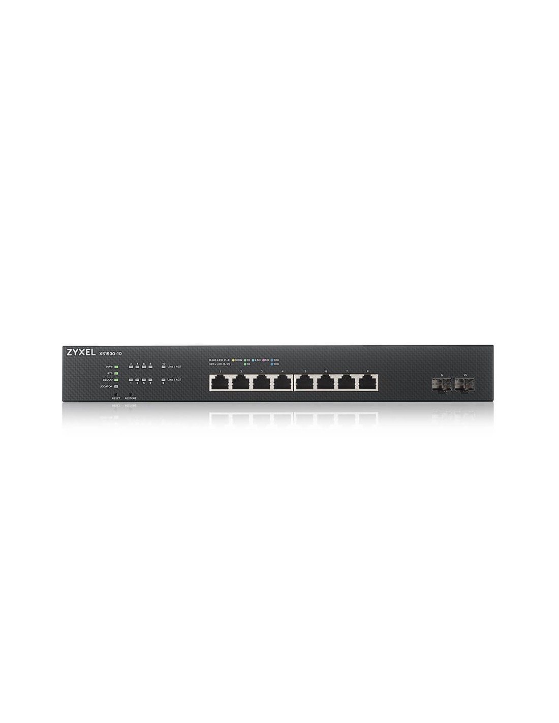 Zyxel XS1930-10-ZZ0101F. Tipo de interruptor: Gestionado, Capa del interruptor: L3. Puertos tipo básico de conmutación RJ-45 Ethernet: 10G Ethernet (100/1000/10000), Cantidad de puertos básicos de conmutación RJ-45 Ethernet: 8. Tabla de direcciones MAC: 16000 entradas, Capacidad de conmutación: 200 Gbit/s. Estándares de red: IEEE 802.1p, IEEE 802.1s, IEEE 802.1w, IEEE 802.3ab, IEEE 802.3ad, IEEE 802.3ae, IEEE 802.3af,.... Montaje en rack